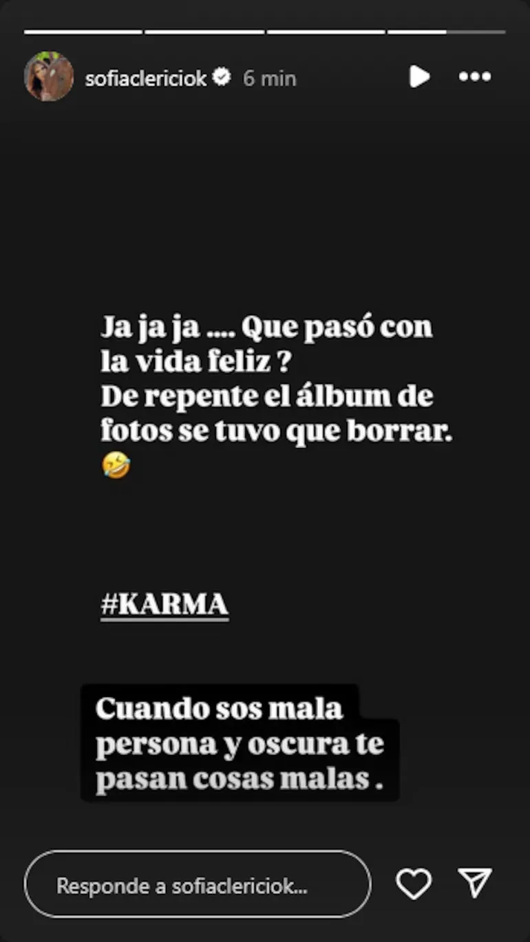 Sin embargo, su actitud no se detuvo ahí. Horas después, redobló la apuesta con otro comentario aún más directo: “¿Qué pasó con la vida feliz? De repente el álbum de fotos se tuvo que borrar”, junto a un emoji riendo a carcajadas. Como si no fuera suficiente, cerró con una frase aún más provocadora: “#KARMA. Cuando sos mala persona y oscura, te pasan cosas”.