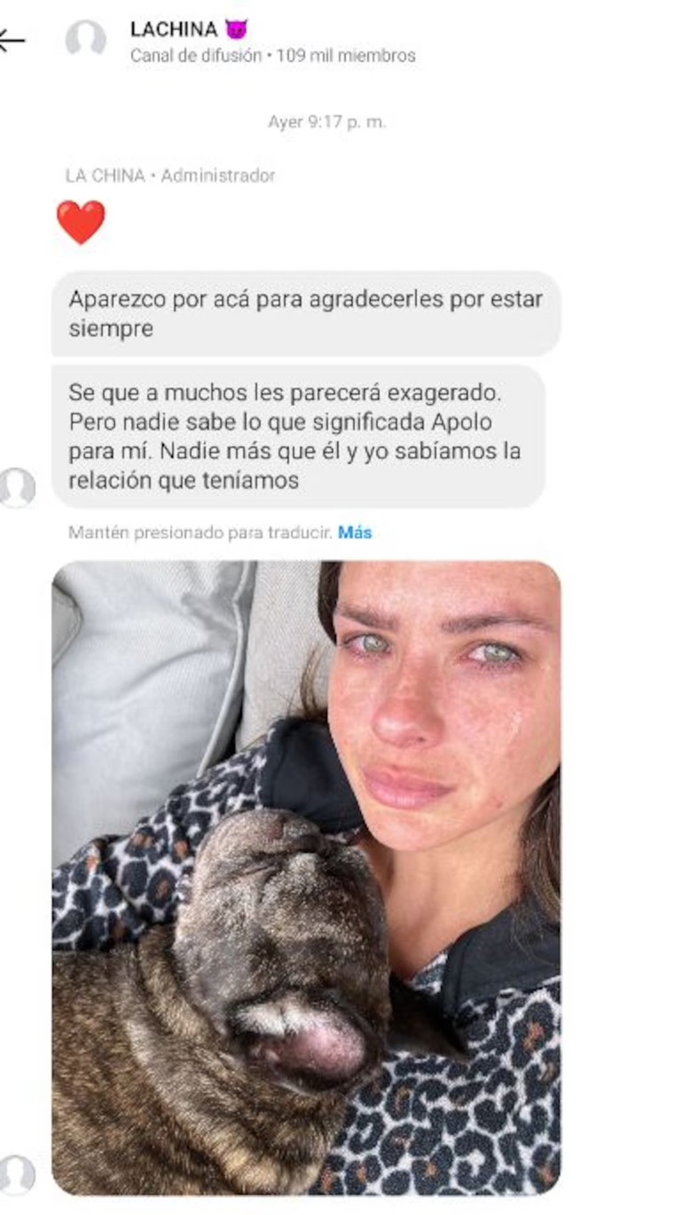 En la imagen que había publicado antes de alejarse de las redes, se pudo ver a la China en modo selfie con los ojos repletos de lágrimas y muy triste por la partida de su perrito. Según explicó en más de una oportunidad, Apolo no era solo una mascota, sino que era un miembro de su familia, un confidente que había estado a su lado en los momentos más importantes de su vida y una debilidad tanto para ella como para sus hijos Rufina, Magnolia y Amancio.