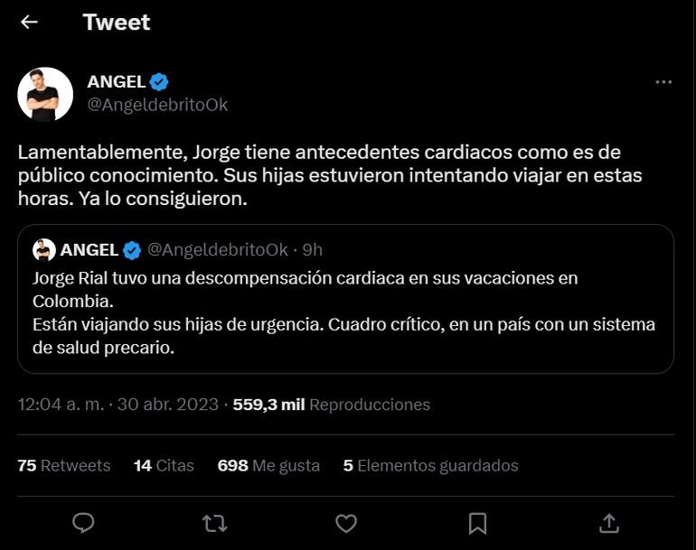 La información comenzó a correr el sábado por la noche de la mano de Ángel de Brito, quien se encargó de contar cómo era el estado de salud de Jorge Rial. En un principio encendió las alarmas al comentar que el periodista se encontraba en estado crítico.