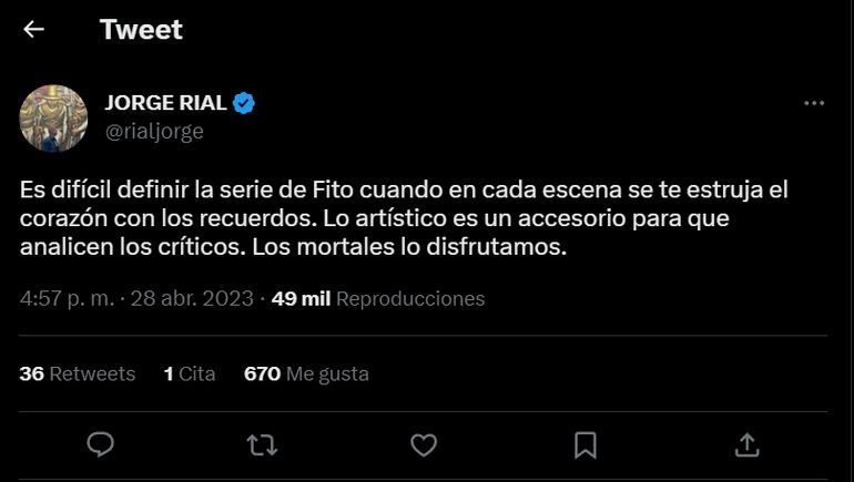 “Lo artístico es un accesorio para que analicen los críticos. Los mortales lo disfrutamos”, mencionó sobre lo bien que la estaba pasando mientras se encontraba tranquilo y mirando la serie. Sin embargo, a las pocas horas cayó la noticia.
