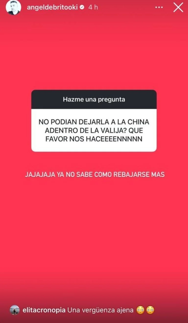 Así, mientas el fin de semana, Mauro compartió un video en el que mostraba la 'sorpresa' que le dio la China llegando inesperadamente a su casa a bordo de una valija, el público fue a preguntarle a Ángel qué pensaba al respecto.