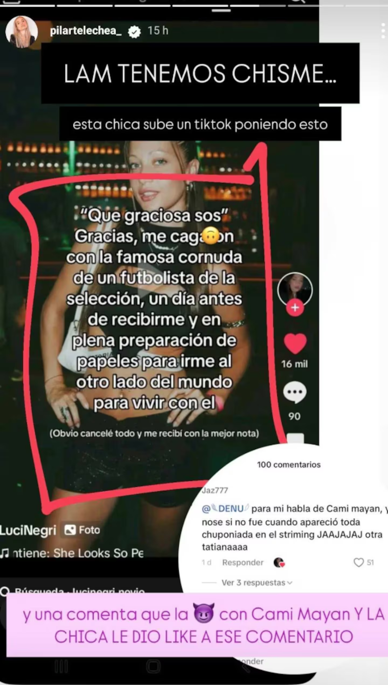 En este contexto, otra usuaria explicó por qué cree que la chica a la que le fueron infiel está hablando de Camila Mayan. “Para mí habla de Cami Mayan, habrá sido cuando apareció toda chuponeada en el streaming, otra Tatiana”, dijo, a lo que la víctima de la infidelidad le puso like.