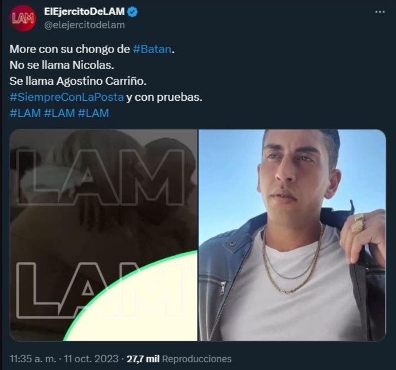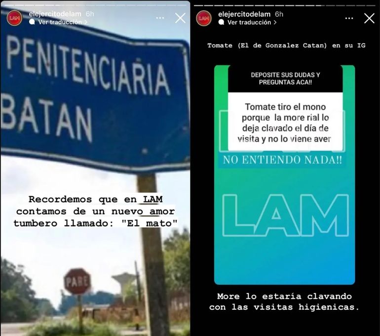 “More Rial está a dos puntas. Dos puntas tumberas. El chongo de González Catán (Matías alias Tomate) se enteró por la tele que More también anda con el de Batán”, se informó desde la cuenta del Ejército de LAM, en donde se sigue minuciosamente la situación amorosa de ella.