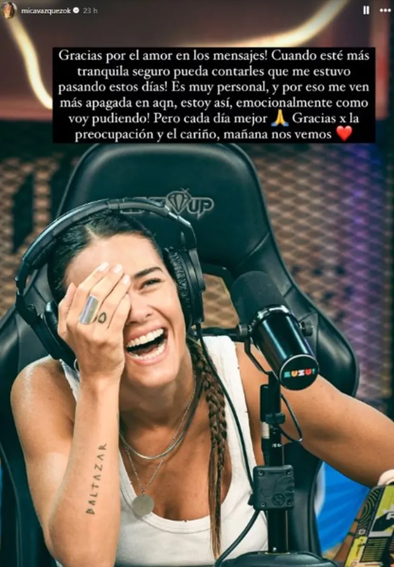 Sumado a esto Vázquez contó en su breve texto expuesto para sus fanáticos: "Estoy así, emocionalmente como voy pudiendo. Pero cada día mejor. Gracias por la preocupación y el cariño. Mañana nos vemos", escribió ante los mensajes de los miles de seguidores que enviaron su apoyo y también preguntaron por su situación.