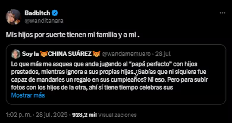 Tras el festejo del cumpleaños de Amancio, Wanda Nara decidió responder el mensaje que una usuaria le dejó al respecto en X y expresó: “Mis hijos por suerte tienen a mi familia y a mí”. De esta manera, buscó dejar en claro que los niños tienen una red de contención importante a pesar de que sus padres se encuentren en el extranjero.