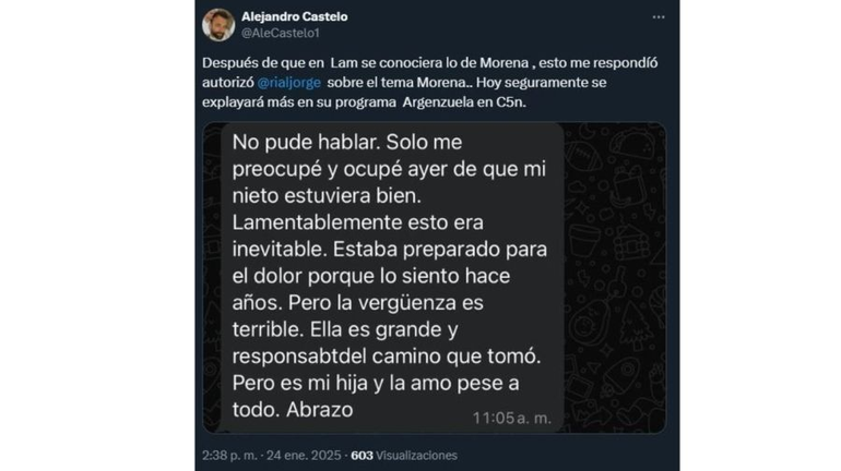 El periodista Alejandro Castelo, de Puro Show (eltrece), compartió en su cuenta en X el mensaje que le escribió el conductor tras tomar conocimiento de la detención de su hija mayor. "No pude hablar. Solo me preocupé y ocupé ayer de que mi nieto estuviera bien", dijo el periodista de C5N, refiriéndose a su nieto menor, Amadeo, que se encontraba en el auto junto al resto de las personas que también fueron detenidas en ese incidente.
