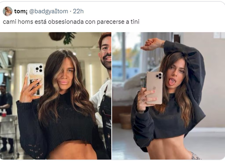 “Cami Homs está obsesionada con parecerse a Tini”, escribió la usuaria de Twitter. De todas maneras, podría ser solo una casualidad, teniendo en cuenta que Tini actualmente tiene el cabello corto y rubio.