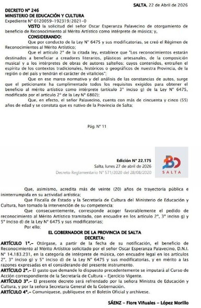 La decisión de reconocerlo ocurrió en el marco del régimen de Reconocimiento al Mérito Artístico y oficializada de un decreto (N° 246) que fue rubricado por el gobernador Gustavo Sáenz y la ministra de Educación, Cultura, Ciencia y Tecnología, Cristina Fiore. Esta decisión fue publicada en el Boletín Oficial.