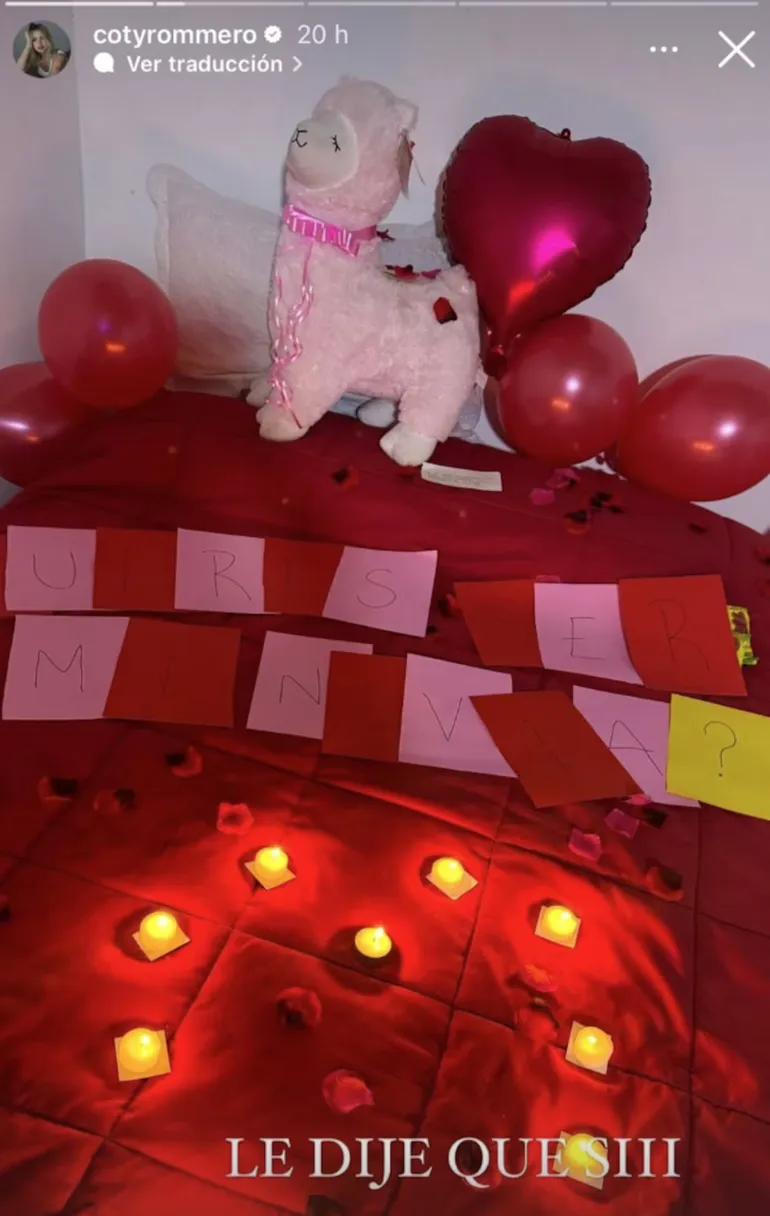 Castañares le preparó a Coti un diálogo entre velitas y pétalos de rosas sobre la cama junto a la pregunta “¿querés ser mi novia?” hecha en papelitos de colores. Además, sumó globos rojos y peluches. Enternecida, ella compartió la imagen de la sorpresa y contó que aceptó la propuesta.