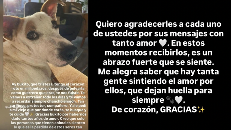 “Ya le pedí a mi viejo que por donde estés, te busque y te cuide”, agregó en su mensaje de despedida y agradeció el tiempo compartido con su mascota.