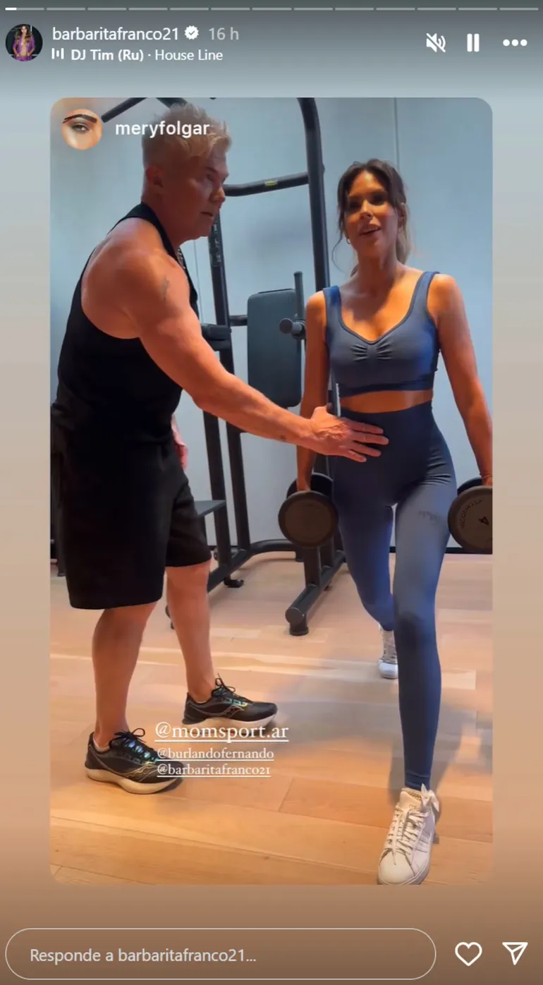 Barby Franco compartió en Instagram fotos y videos que la muestran entrenando con Fernando Burlando en una tarde signada por las risas y la complicidad que caracteriza su relación de pareja.