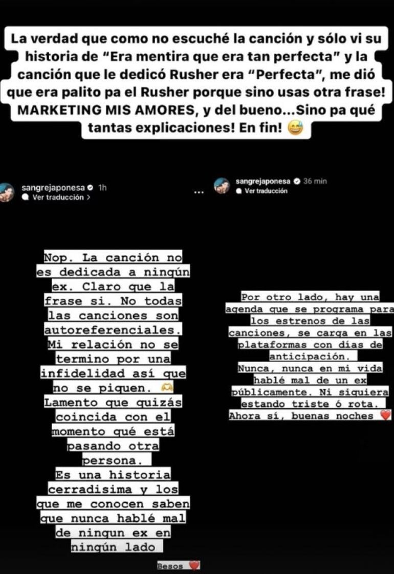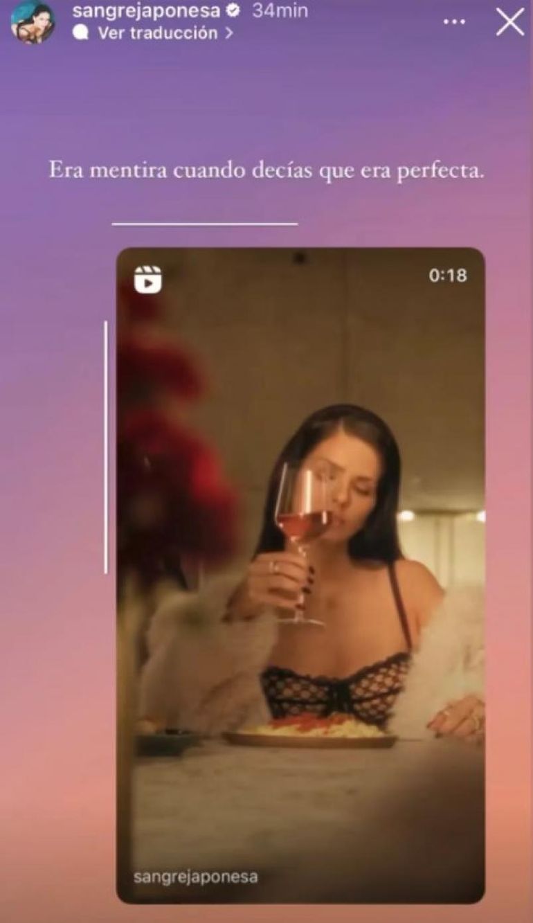 Además de compartirlo en sus historias, escribió la frase “era mentira cuando decías que era perfecta”. Los usuarios tomaron esas palabras como un mensaje para su ex novio que le dedicó la canción Perfecta que hizo en colaboración con Dread Mar I. Incluso, la actriz fue la protagonista del videoclip.