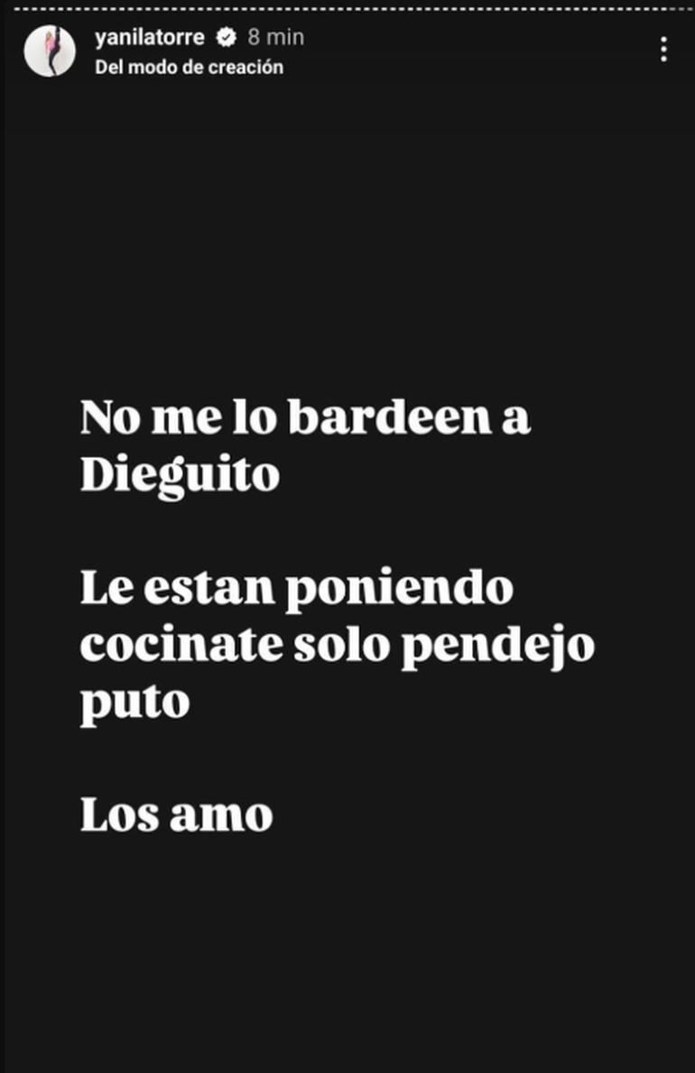 Recientemente, la comunicadora sorprendió a toda su audiencia con un inusual pedido en el cual su marido, Diego Latorre, está involucrado: "No me lo bardeen a Dieguito. Le están poniendo cocinate solo pendejo puto. Los amo", explicaba la postal que compartió en sus historias de esta misma red social. Luego agregó: " Vamos a lo importante. Dieguito desayunó. Diego está en Argentina. Y yo soy de ustedes".