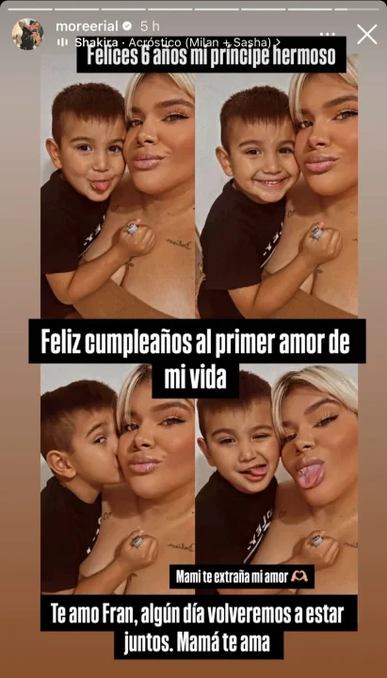 Sobre la publicación, Morena escribió: “Felices seis años mi príncipe hermoso” y añadió “Feliz cumpleaños al amor de mi vida. Mami te extraña mi amor. Te amo Fran, algún día volveremos a estar juntos. Mamá te ama”.