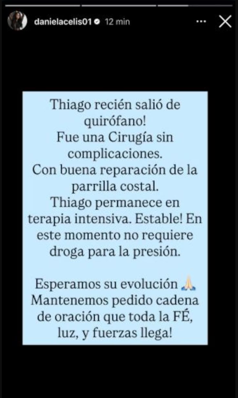 Thiago Medina fue sometido este viernes a una cirugía en el Hospital Mariano y Luciano de la Vega. El procedimiento médico se realizó con la finalidad de “reparar la parrilla costal”, zona seriamente dañada. La operación demandó varias horas y, una vez concluida, Daniela Celis recurrió a sus redes sociales para dar detalles sobre la evolución de su expareja y, además, conversó con los medios de comunicación que seguían de cerca el caso.