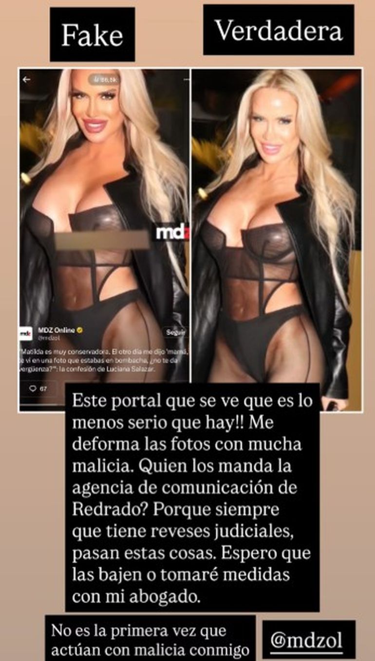 Luciana Salazar no ocultó su enojo en las redes sociales con una situación particular donde puso en duda a un medio de comunicación por modificaciones en imágenes suyas que fueron publicadas en el portal de noticias digital. En su denuncia pública hecha en su cuenta personal de Instagram mencionó también a su expareja Martín Redrado.