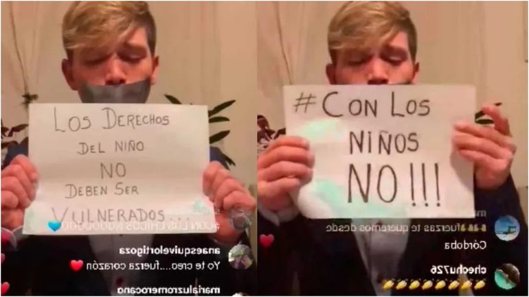 Allí, sin hablar y con los labios cubiertos por cinta adhesiva, Lucas Benvenuto compartió una serie de carteles en donde se podía leer las palabras “Jamás” y las frases (una en cada uno de los papeles), “Los derechos del niño no deben ser vulnerados” y “¡¡¡Con los niños no!!!”.