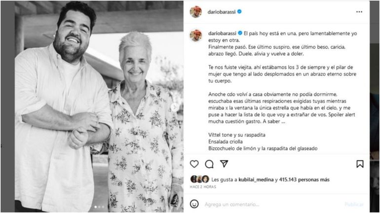 "El país hoy está en una, pero lamentablemente yo estoy en otra. Finalmente pasó. Ese último suspiro, ese último beso, caricia, abrazo llegó. Duele, alivia y vuelve a doler. Te nos fuiste, viejita", compartió Barassi junto a una conmovedora fotografía en blanco y negro que captura un emotivo momento entre él y su madre, Laura.