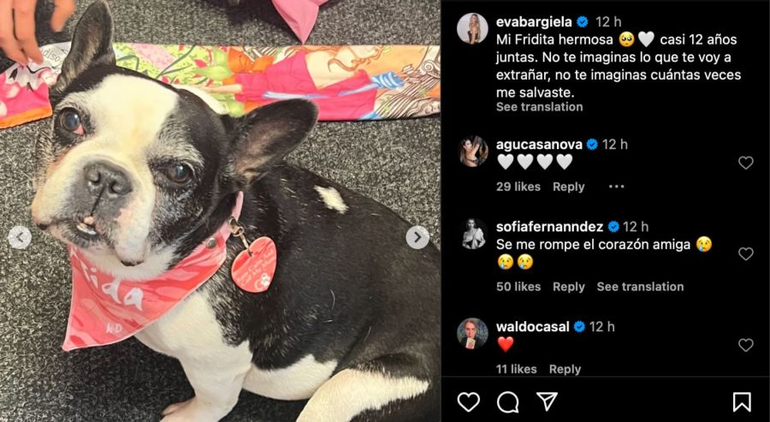 "Mi Fridita hermosa, casi 12 años juntas. No te imaginas lo que te voy a extrañar, no te imaginas cuántas veces me salvaste", escribió en el posteo. Sus amigos, familia y seguidores no tardaron en darle el pésame y dedicarles dulces palabras que la acompañen en este duro momento.