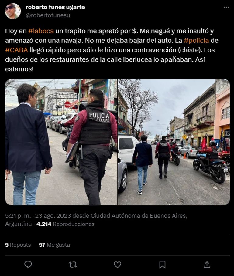 Roberto Funes Ugarte reveló recientemente en sus redes sociales que le tocó vivir un mal momento en el barrio porteño de La Boca. Se debe a que intentó estacionar en el barrio porteño de La Boca cuando fue increpado por un trapito que terminó amenazándolo con una navaja.