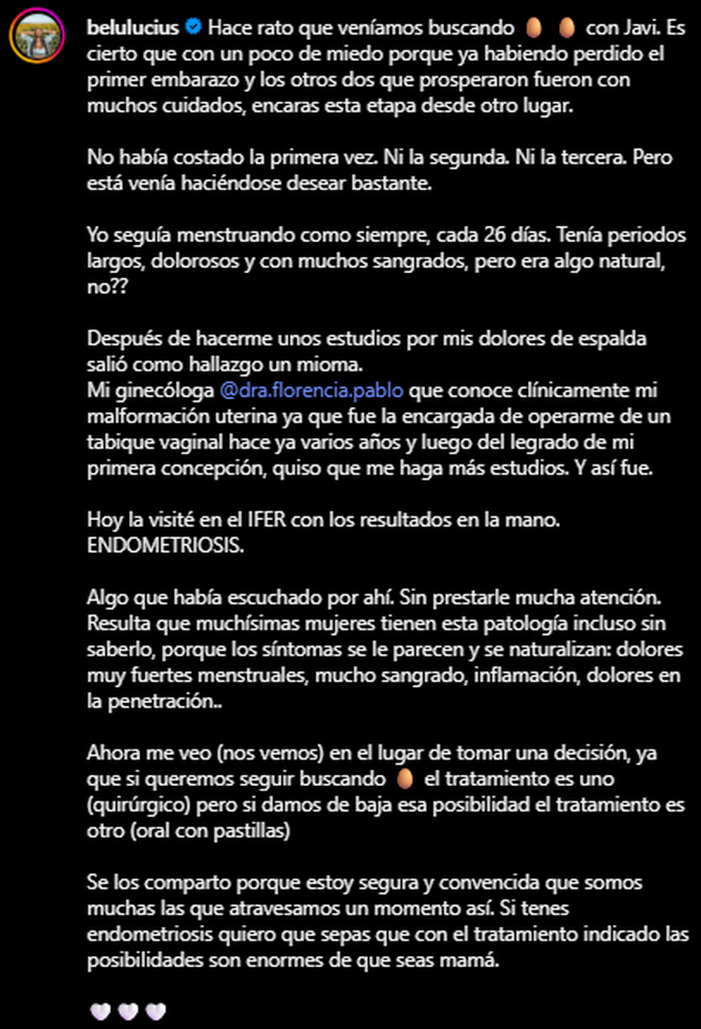 Lucius grabó un video en el baño de su casa en el que registró el momento en el que se hizo un test de embarazo, acompañada por su esposo. Primero mostraron el resultado a la cámara y después lo vieron ellos. “No”, expresaron con un dejo de tristeza al ver la palabra negativo. “Todos muestran los videitos que sí, que no”, sostuvo Belu. Acto seguido, en la descripción del posteo, reveló la enfermedad con la que la diagnosticaron, que los puso en la situación de tomar una decisión respecto a su deseo de volver a quedar embarazada.