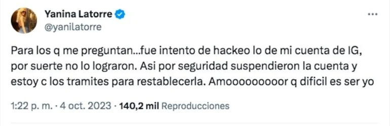 Por su parte, publicó un mensaje en su cuenta de Twitter (X) explicando lo sucedido: "Para los que me preguntan…fue intento de hackeo lo de mi cuenta de IG, por suerte no lo lograron. Así que por seguridad suspendieron la cuenta y estoy con los trámites para restablecerla. Amooooooooor que difícil es ser yo", expresó.