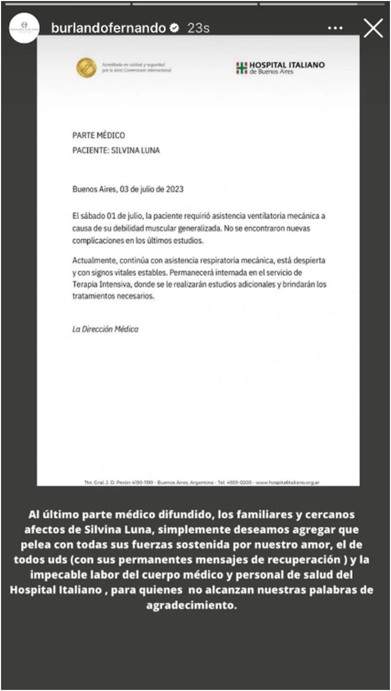 “El sábado 01 de julio, la paciente requirió asistencia ventilatoria mecánica a causa de su debilidad muscular generalizada. No se encontraron nuevas complicaciones en los últimos estudios”, explica el la primera parte del parte médico compartido por el mediático abogado.