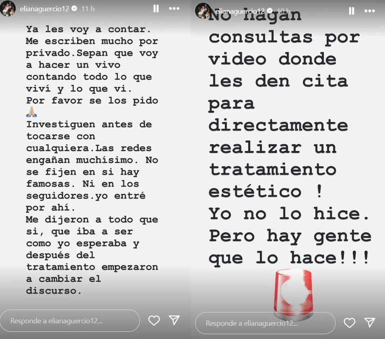 En este marco, Eliana detalló su experiencia personal y compartió recomendaciones sobre los cuidados que deben tenerse al elegir a un profesional para un tratamiento estético. "Me dijeron a todo que sí, que iba a ser yo como yo esperaba y después del tratamiento empezaron a cambiar el discurso. No hagan consultas por video donde les den cita para directamente realizar un tratamiento estético! Yo no lo hice, pero hay gente que lo hace", enfatizó.