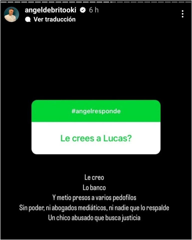 “Sí. Fíjate que ninguno reposteó las fotos que, desesperadamente, Jey buscaba en la fiesta. Telefe lo hizo ir después de la terna. Nunca lo ponchó y tampoco subió en el homenaje a ‘Polémica’”, aseguró antes de salir a apoyar a Lucas Benvenuto: “Le creo. Lo banco. Y metió preso a varios pedófilos sin poder, ni abogados mediáticos, ni nadie que lo respalde. Un chico abusado que busca justicia”.