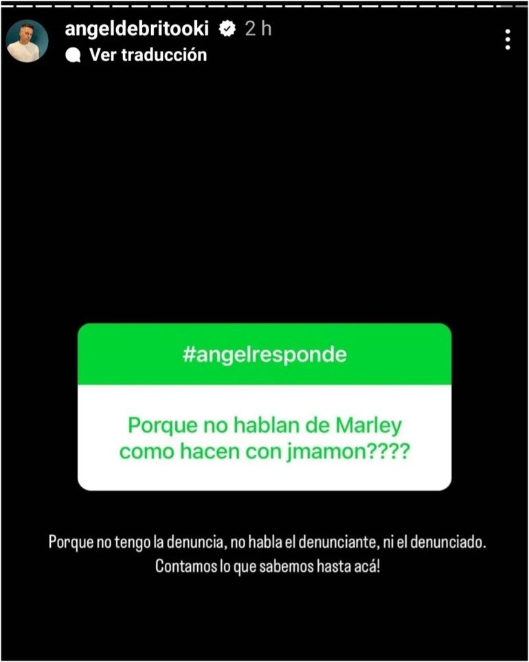 “¿Por qué no hablan de Marley como hacen con Jey Mammón?”, fue la pregunta que le hicieron a Ángel y que no eligió ignorar, a tal punto que la compartió para todos y dio su respuesta: “Porque no tengo la denuncia, no habla el denunciante, ni el denunciado ¡Contamos lo que sabemos hasta acá!”.