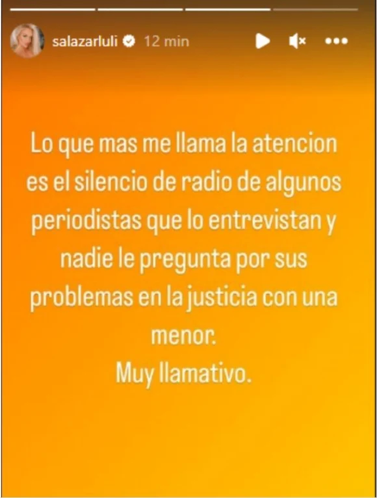 Por último, en otra story, Luciana cerró: “Lo que más me llama la atención es el silencio de radio de algunos periodistas que lo entrevistan y nadie le pregunta por sus problemas en la Justicia con una menor. Muy llamativo”.