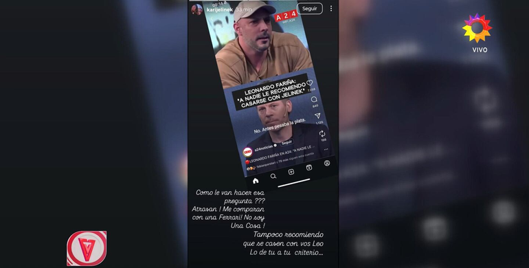 Leonardo Fariña no recordó con cariño a su ex esposa, la modelo Karina Jelinek, lo que provocó la reacción en caliente de ella con un posteo que se mostró en el programa de Viviana Canosa.