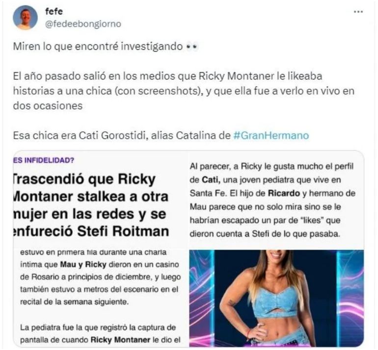 "El año pasado salió en los medios que Ricky Montaner le likeaba historias a una chica (con screenshots), y que ella fue a verlo en vivo en dos ocasiones. Esa chica era Cati Gorostidi, alias Catalina de #GranHermano", reveló Bongiorno. Según parece, este hecho generó tensiones en la relación de Montaner y Roitman, quienes enfrentaron rumores previos de infidelidad.