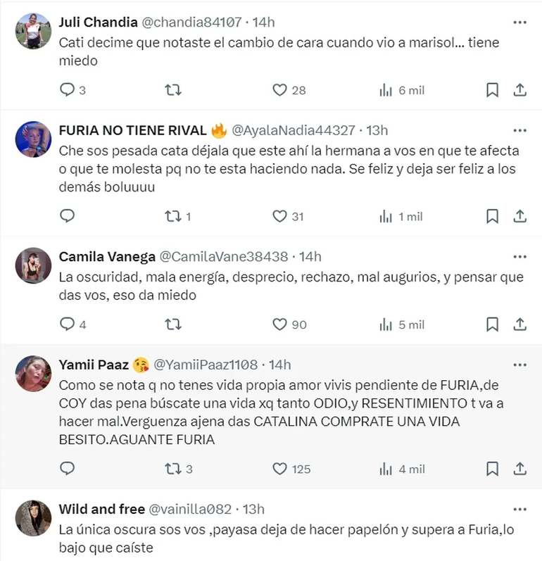 "Jajaja a nosotros nos da miedo tu cara, estás para psiquiatría"; "Catalina estás demasiado al pendiente de furia y todo lo que la rodea, tenés seguidoras habla con ellas, enfócate en lo bueno esto no te hace bien, se te ve desbordada, que vuelva la cata divertida y ya sabes, porfa, no lo mufes al chinito porfa porfa", rezaban algunas de las respuestas.