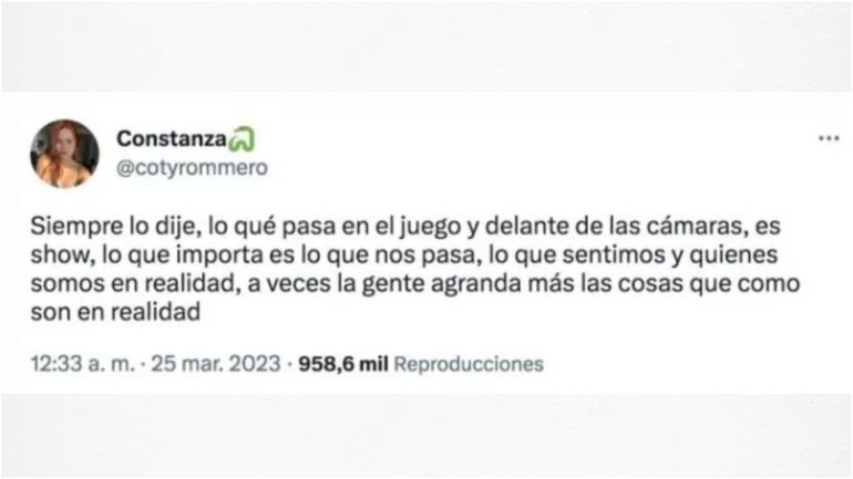 La propia Coti usó sus redes sociales y dejó su impresión sobre haber vuelto a la casa de Gran Hermano. "Se merecen mucho por su aguante, aguante los tres", aseguró la correntina antes de agregar: "Siempre lo dije, lo qué pasa en el juego y delante de las cámaras, es show. Lo que importa es lo que nos pasa, lo que sentimos y quienes somos en realidad. A veces la gente agranda más las cosas que como son en realidad".
