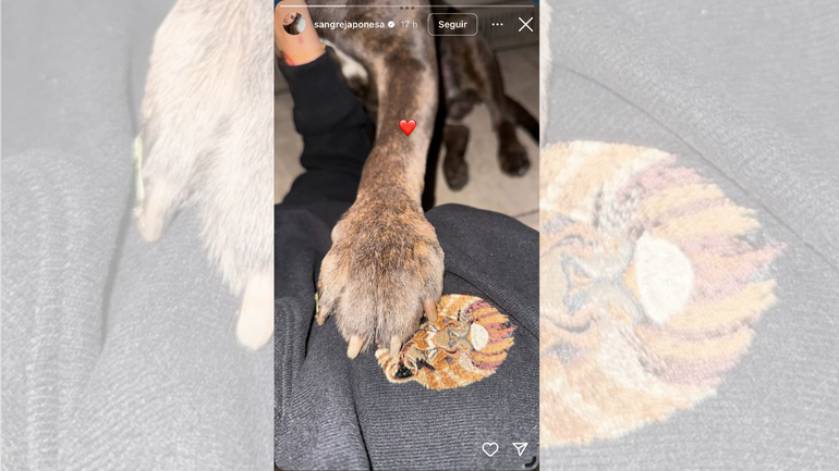 Una foto compartida por la actriz generó todo tipo de especulaciones sobre un posible embarazo. Es que Sangre Japonesa, como se presenta en Instagram, subió una historia en su perfil en la que se la ve junto a un perro bulldog francés marmolado y una remera con un aplique de león.