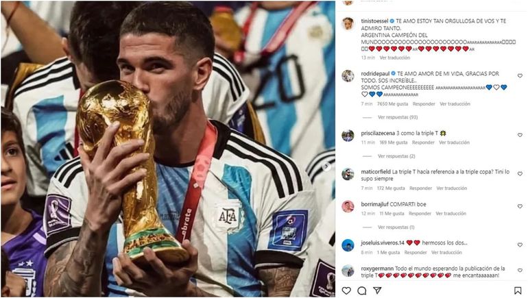 “Te amo, estoy tan orgullosa de vos y te admiro tanto. ¡Argentina campeón del mundo!”, escribió la cantante en las redes sociales. “Te amo, amor de mi vida. Gracias por todo, sos increíble ¡Somos campeones!”, le respondió el futbolista.