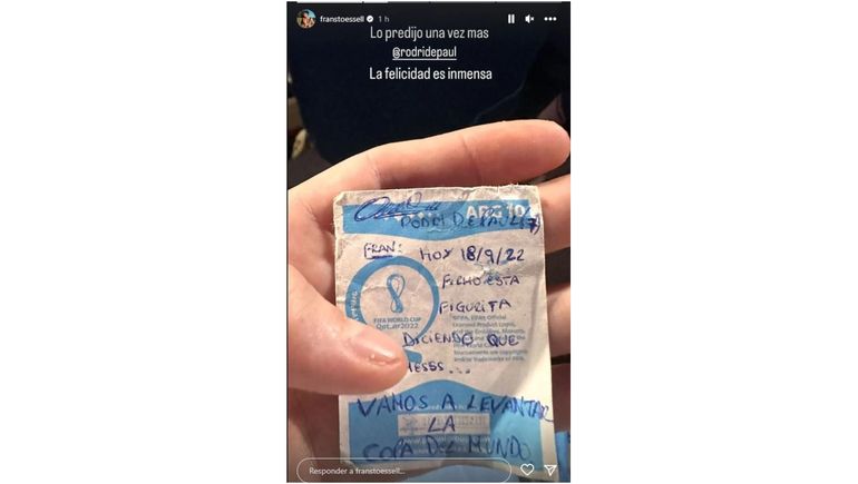 Es que en sus stories de Instagram, el hermano de Tini Stoessel mostró el reverso de una figurita en donde Rodrigo de Paul escribió lo que él creía que iba a ser el futuro de la Scaloneta (que ayer se terminó cumpliendo).