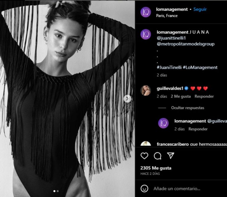 Fueron corazones rojos lo que la actriz comentó en una publicación de la agencia que Juana representa en Europa. En la fotografía se puede ver a la mujer más chica del clan Tinelli posando para una sesión fotográfica. En total confianza y por el cariño que le tiene Guillermina Valdés no dudó en darle aliento y expresar su felicidad al verla hacer a Juanita lo que tanto ama.