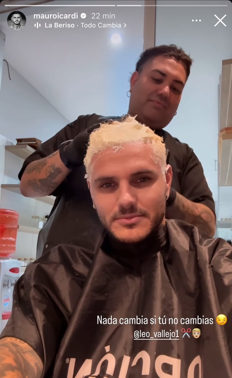 Icardi mostró a través de sus historias en Instagram, su nuevo look. En el video se ve como se está tiñendo el pelo. “Nada cambia si tú no cambias”, escribió el futbolista, además de etiquetar la cuenta de su peluquero, leo_vallejo1, y acompañado de la canción “Todo cambia” de la banda La Beriso. Leonardo Vallejo es un peluquero que es reconocido por cortarle el pelo a algunas celebridades. En su cuenta de Instagram cosechó más de 34 mil seguidores, lo que lo convierte, para su rubro, en alguien notable.