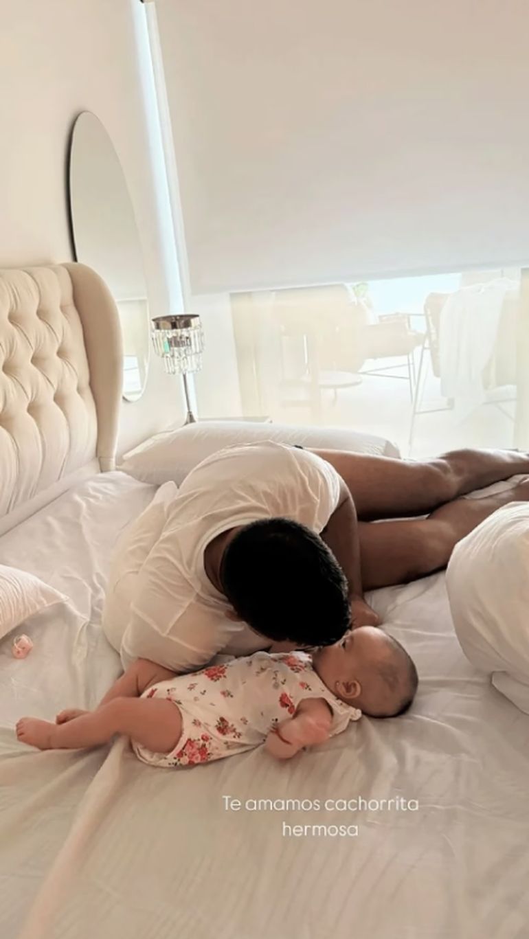 Asimismo, también publicó una foto en la que se puede ver al ex futbolista junto a su hija recostada en la cama. “Te amamos, cachorrita hermosa”, escribió la influencer mientras mostraba la ternura con la que suelen jugar padre e hija.