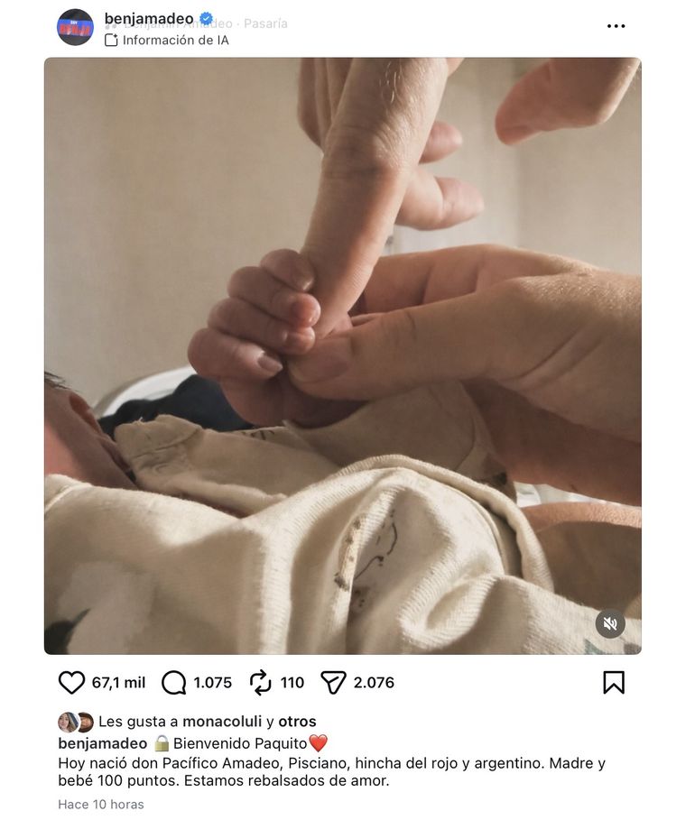 “Bienvenido Paquito. Hoy nació don Pacífico Amadeo, pisciano, hincha del rojo y argentino. Madre y bebé 100 puntos. Estamos rebalsados de amor”, escribió Amadeo en su perfil de Instagram y cosechó cientos de miles de mensajes.