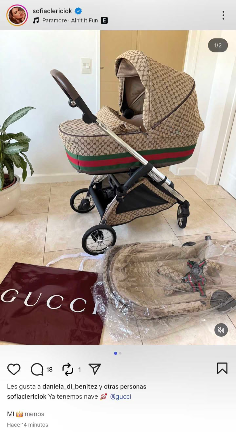En su perfil de Instagram, la mediática publicó una imagen de un cochecito de la marca Gucci. “Ya tenemos nave”, detalló ella en la descripción del posteo. A los pocos segundos, la foto se llenó de comentarios de sus seguidores que estaban sorprendidos con el anuncio. “Felicidades, vas a ser una excelente madre”, le envió una usuaria a lo que Sofía le respondió con emojis de corazones.