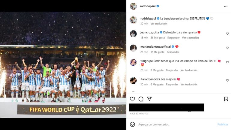 En tanto que el futbolista compartió varias historias en su cuenta de Instagram y una foto con la frase: “La bandera en la cima”. Vale recordar que, en el partido de la semifinal contra Croacia, De Paul le dedicó sentidas palabras a la cantante. "Ella está siempre ahí apoyando. Ella es de fierro. Hoy se lo dije antes de salir del hotel, me mandó un mensaje muy lindo", dijo el jugador de la selección campeona.