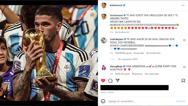 Al mismo tiempo, la joven cantante que se presentará en el Campo Argentino de Polo con entradas agotadas hizo su posteo en su Instagram felicitando a la selección y a Rodri. “TE AMO ESTOY TAN ORGULLOSA DE VOS Y TE ADMIRO TANTO. ARGENTINA CAMPEÓN DEL MUNDOOOOOOOOOOOOOOOOOOOOOO”, escribió Tini a lo que el futbolista le respondió invadido de amor: “TE AMO AMOR DE MI VIDA, GRACIAS POR TODO. SOS INCREÍBLE.. SOMOS CAMPEONEEEEEEEEEE”.
