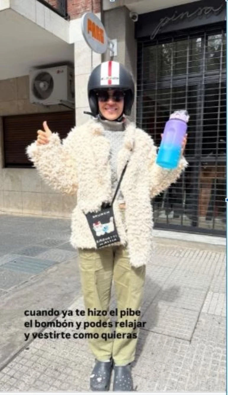 En la foto se la ve después de un paseo en moto, con el casco puesto y un estilo completamente descontracturado. Llevaba un tapado de pelo color crema, un pantalón verde militar, crocs de goma y una cartera estampada con dibujos, mientras sostenía una botella de agua. Nada de glamour ni de producción, pero sí mucho humor y autenticidad, dos rasgos que la caracterizan desde siempre.