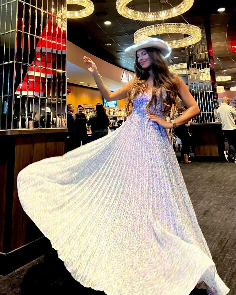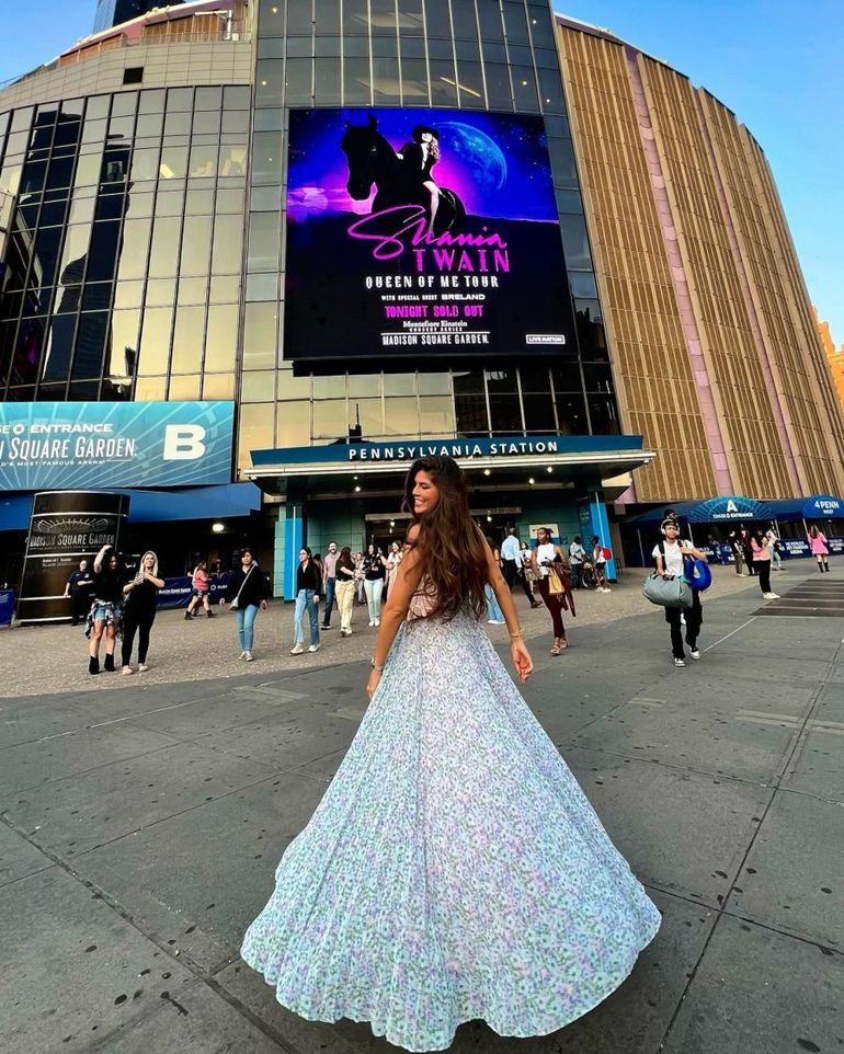 De fondo, se podía ver la fachada del Madison Square Garden y el cartel del show de Shania Twain. Luego, Loly Antoniale mostró el vestido de frente, donde se podía ver una falda plisada y escote corazón.