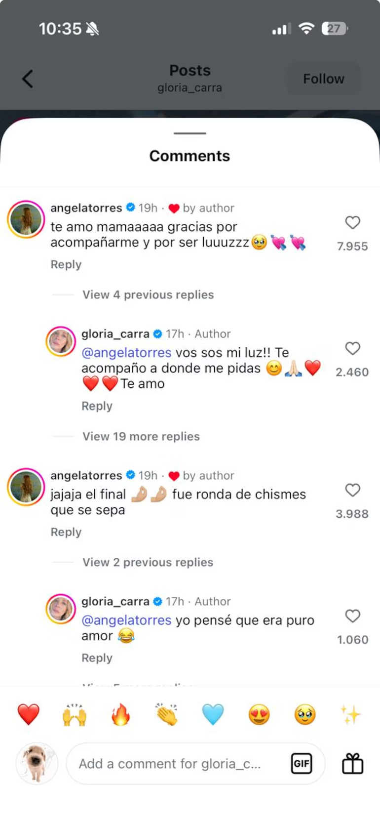 El ida y vuelta entre madre e hija no tardó en sumar más ternura. Ángela comentó: “Te amo mamáaaa, gracias por acompañarme y por ser luuuuzzz”, a lo que Gloria contestó: “Vos sos mi luz!! Te acompaño a donde me pidas. Te amo”. El intercambio siguió en tono de humor y cariño, confirmando la complicidad y el amor: “Jajaja el final fue ronda de chismes, que se sepa”, bromeó Torres. “Yo pensé que era puro amor”, replicó Gloria, acompañando el comentario con emojis.
