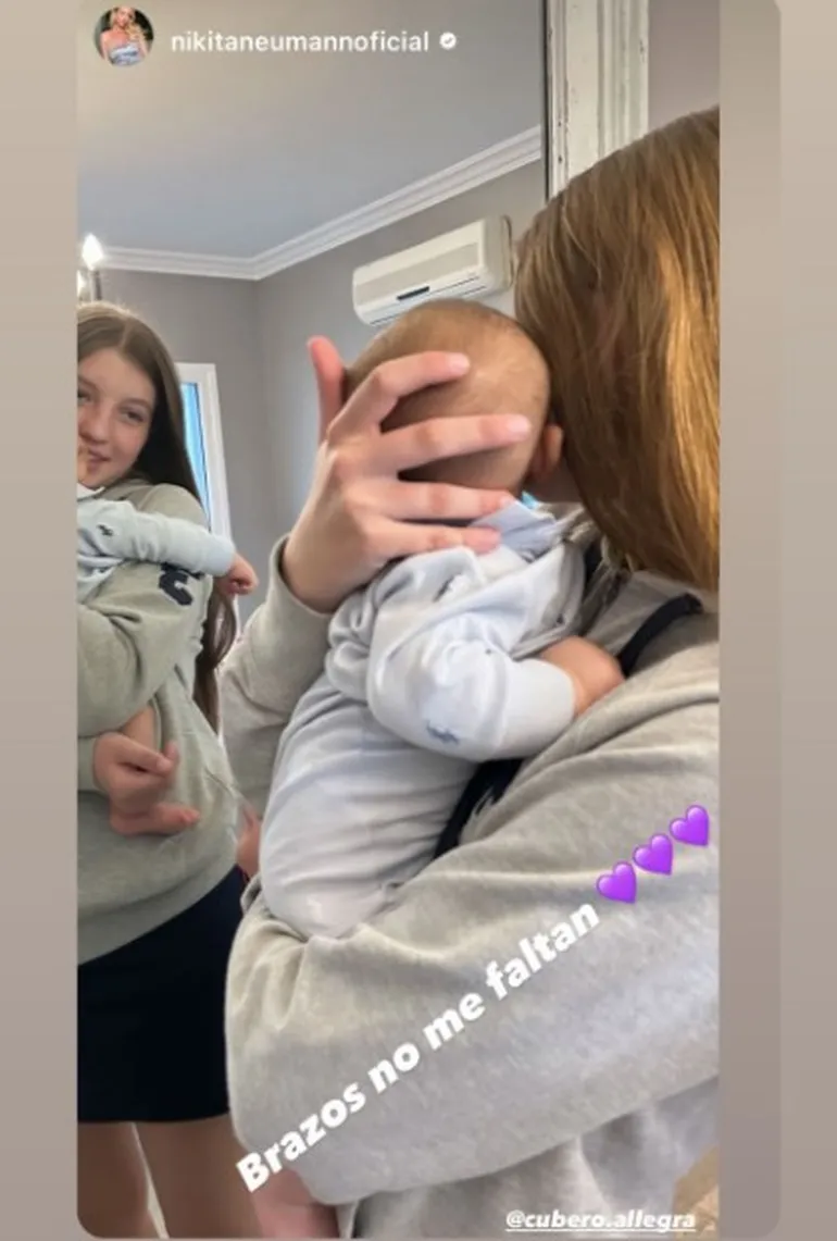 Es que la niña reposteó una imagen que compartió la reconocida modelo en su cuenta personal de Instagram donde se la ve a Allegra con el niño en brazos frente a un espejo y sonriendo mientras mira atentamente su propia imagen retratada en el vidrio. En dicho posteo, Neumann escribió: "Brazos no me faltan".