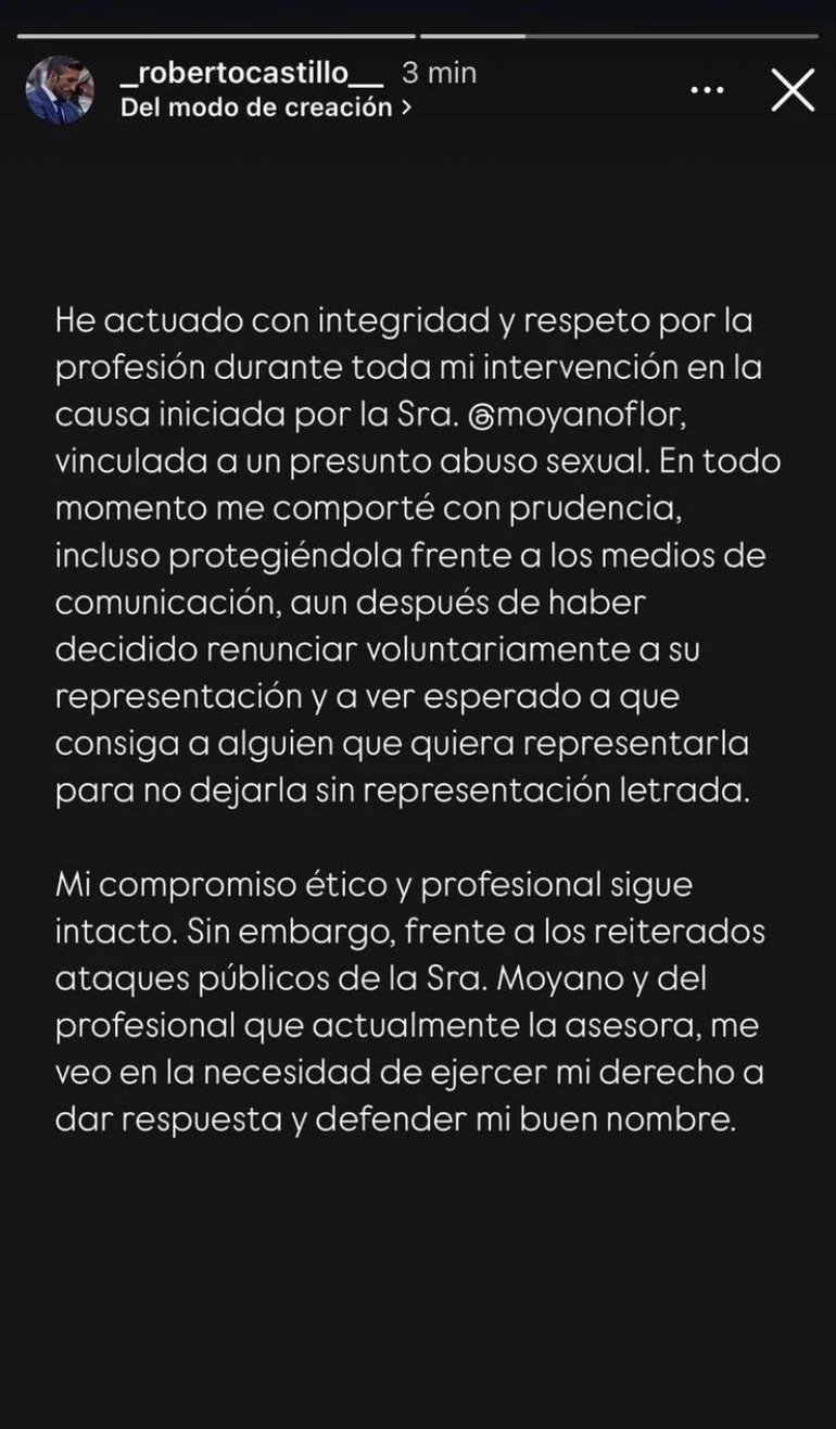 "He actuado con integridad y respeto por la profesión durante toda mi intervención en la causa iniciada por la Sra. Flor Moyano vinculada a un presunto abuso sexual”, arrancó el comunicado en sus redes sociales el letrado y actual pareja de la bailarina.